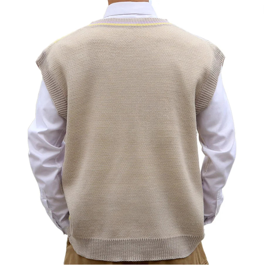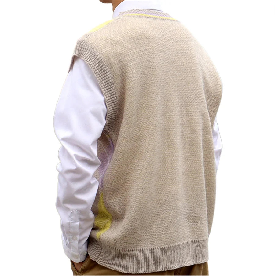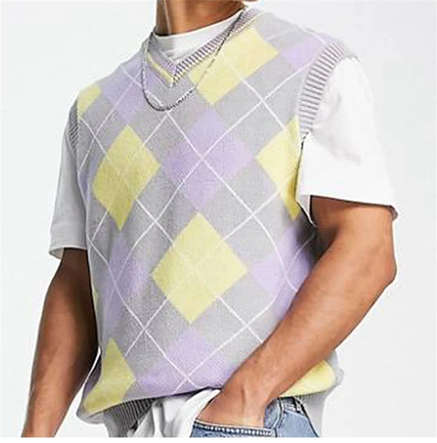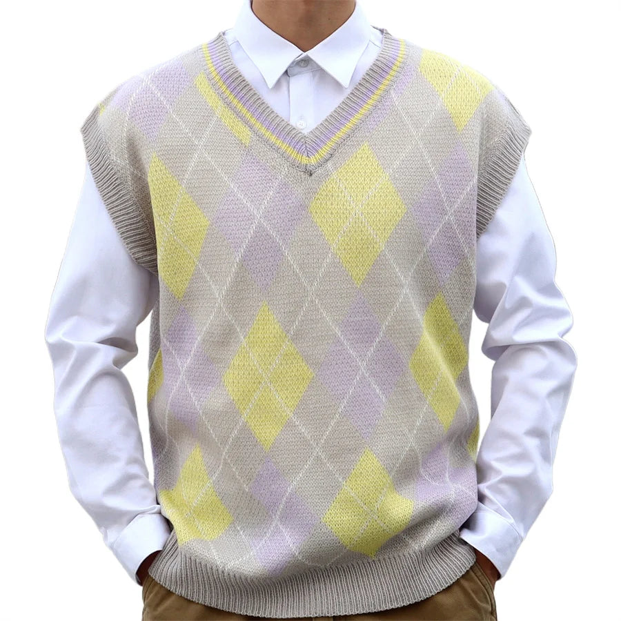New Men's V-neck Knitted Vest Rhombus Plaid Pullovers Waistcoat for Man Korean Style Spring Autumn Thin Sleeveless Sweater