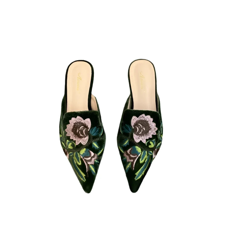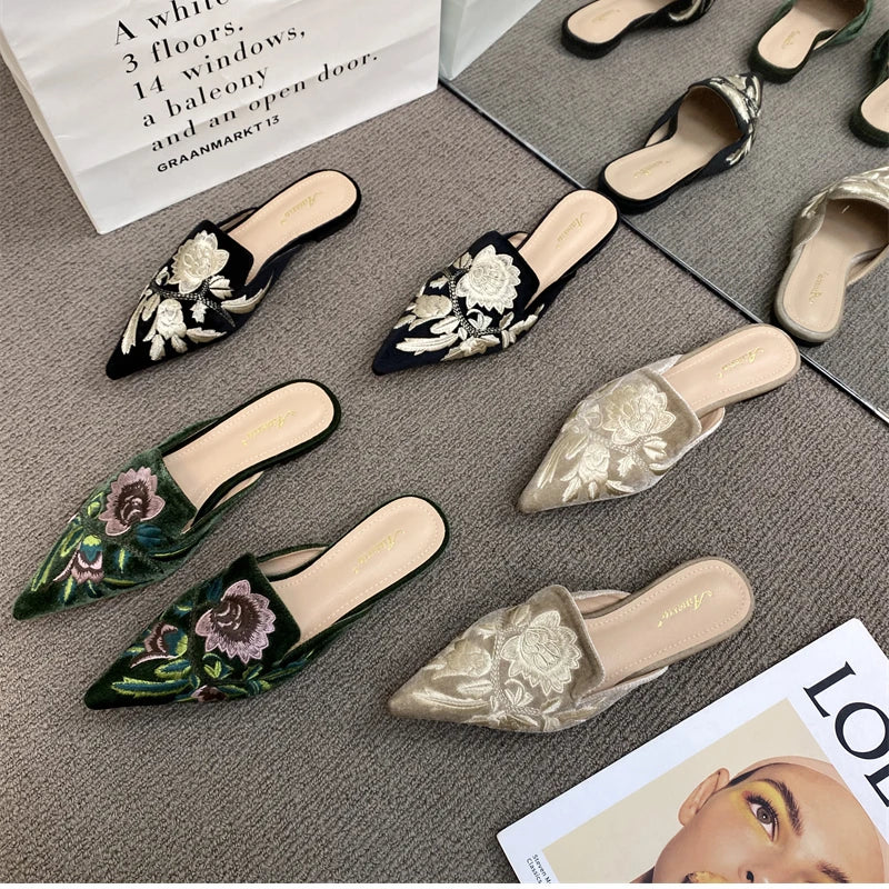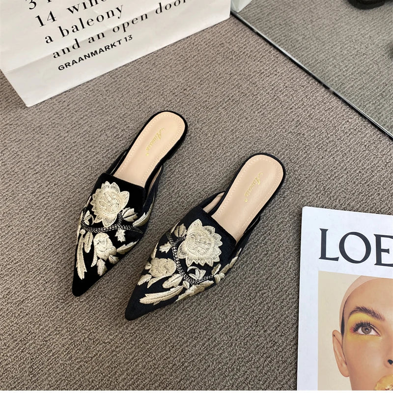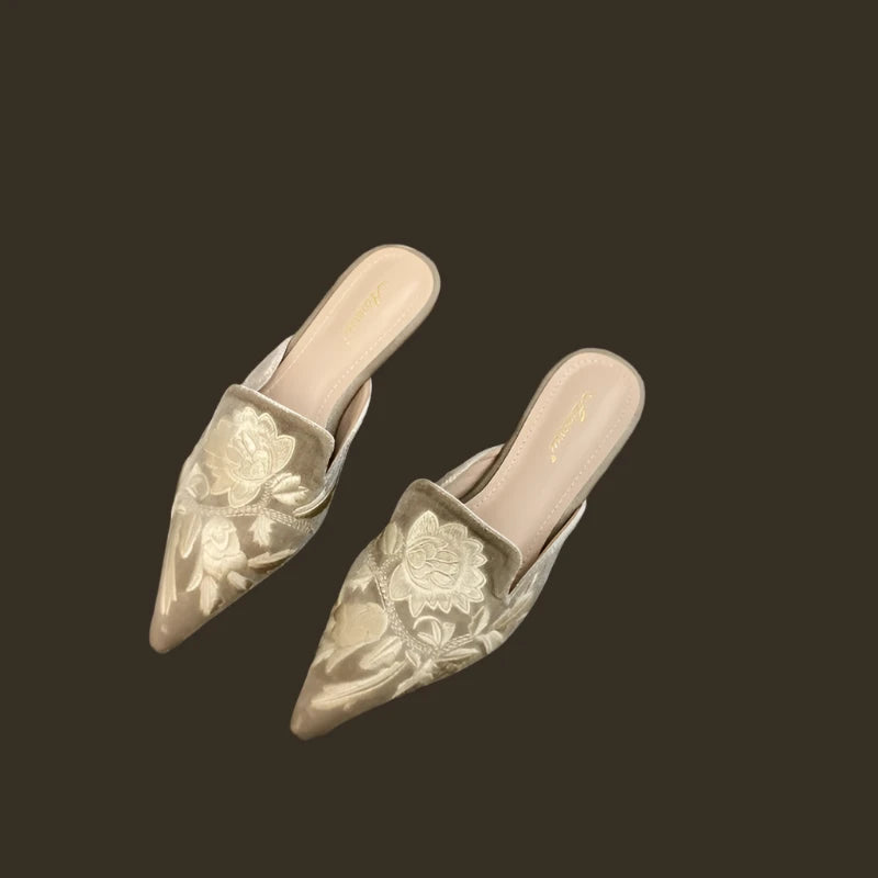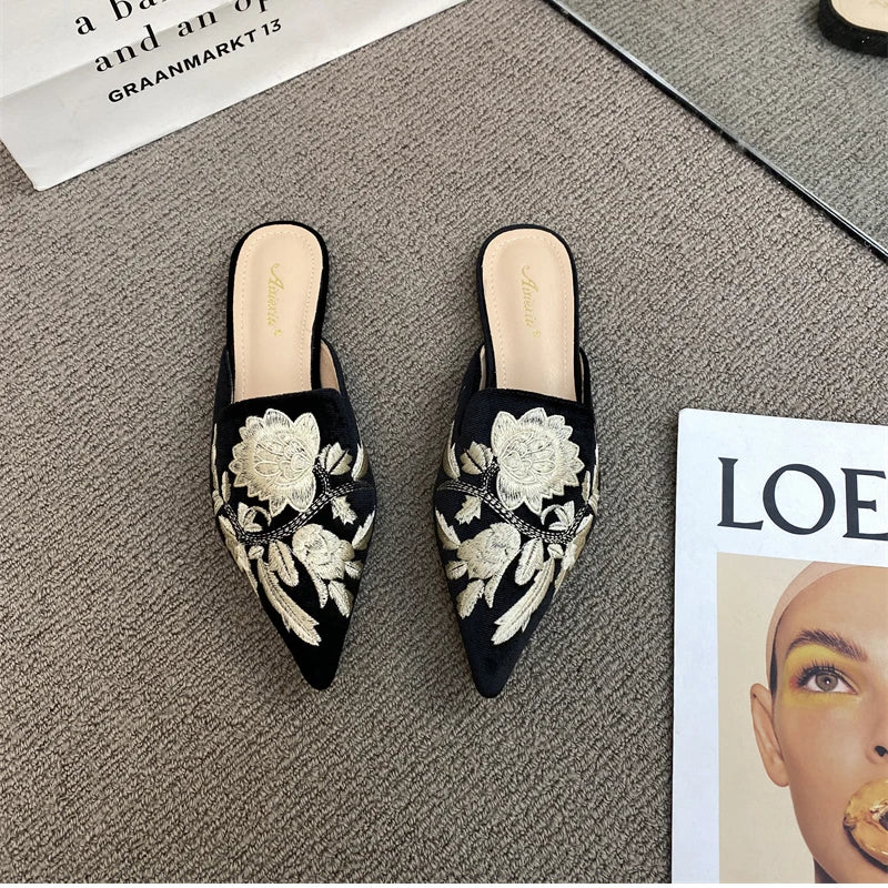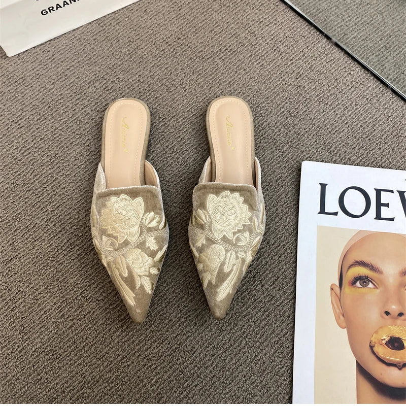 Elegant Summer Embroidered Mules - Women's Luxury Fashion Pointed Toe Flats