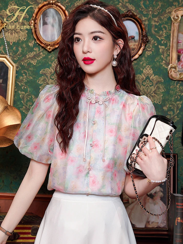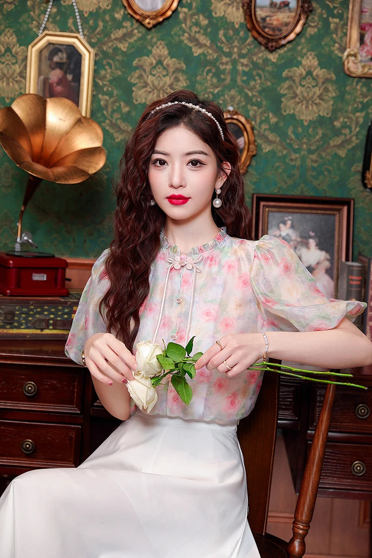 Printed Short Sleeve Blouses – Vintage Chiffon Casual Work Top, Loose and Elegant