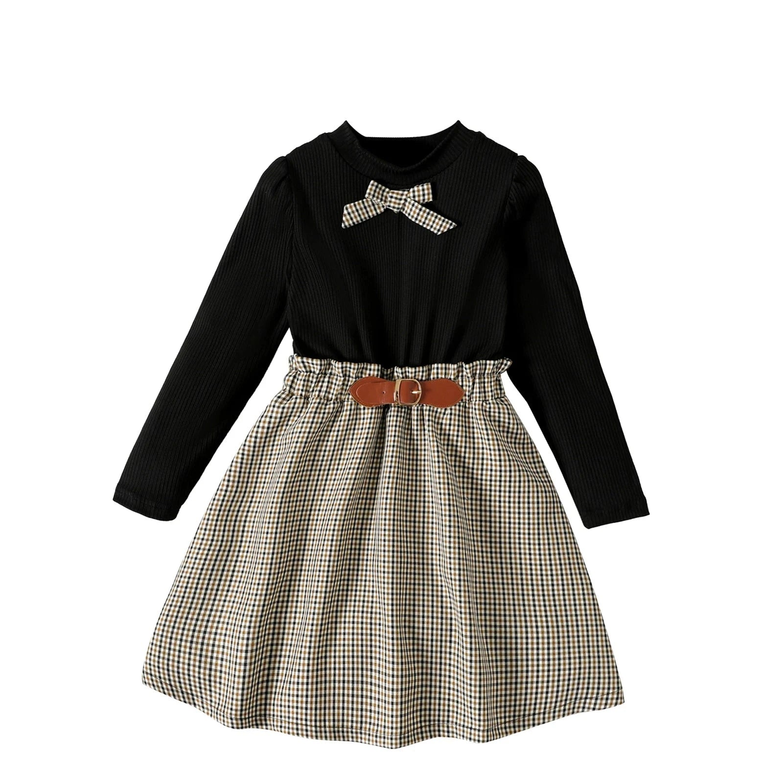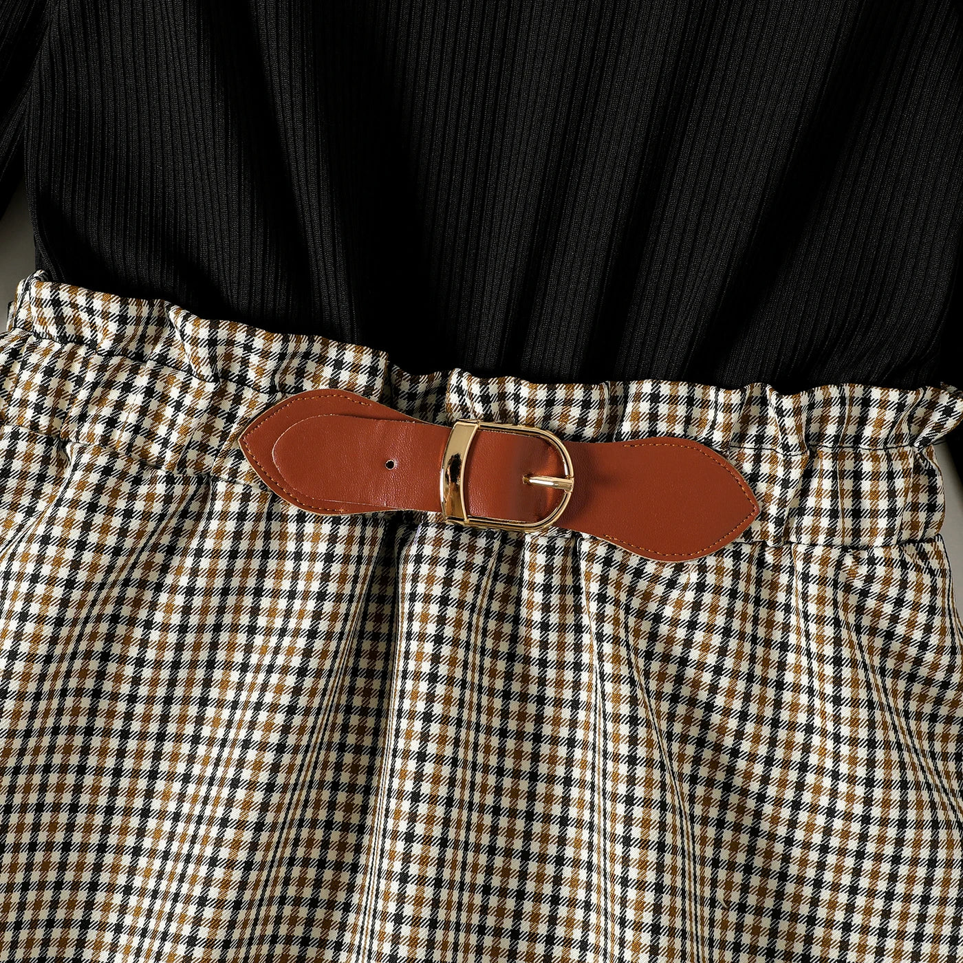 Kid Girl Bowknot Mock Neck Tee & Plaid Skirt Set
